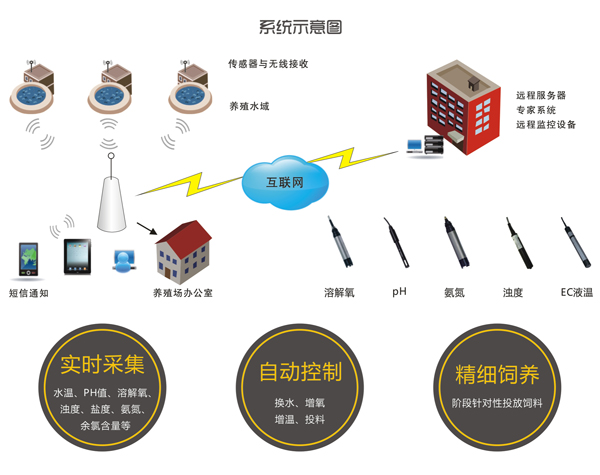 采用具有自识别功能的监测传感器,对水质、水环境信息(温度、光照、余氯、PH值、溶解氧、浊度、盐度、氨氮含量等)进行实时采集,实时监测养殖环境信息,预警异常情况,及时采取措施,降低损失。
